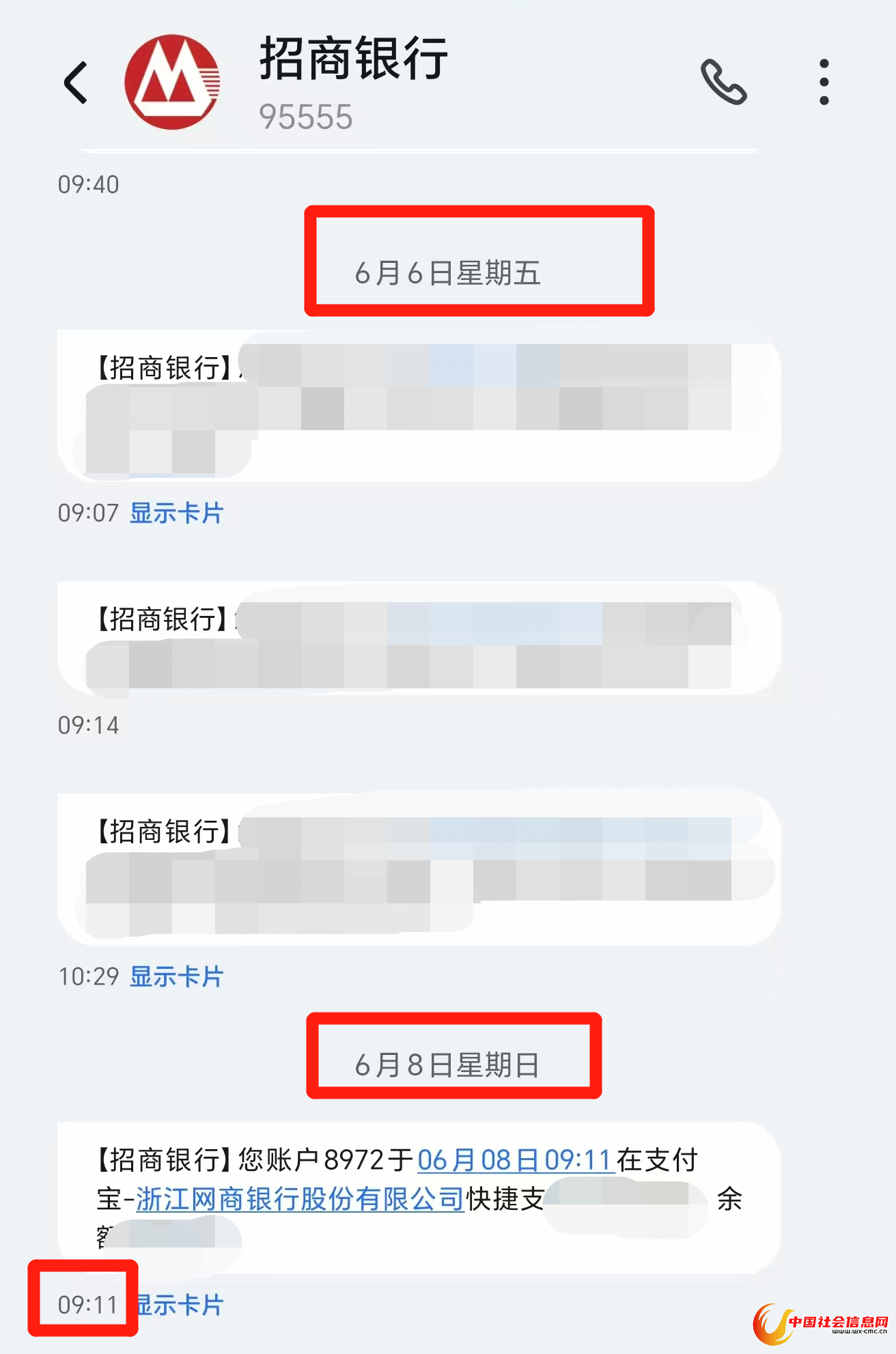 6月8日凌晨,孟先生未收到过相关验证码短信,当天收到的第一条短信为他发现盗刷后把钱转走的动态提醒(图由受访者提供)