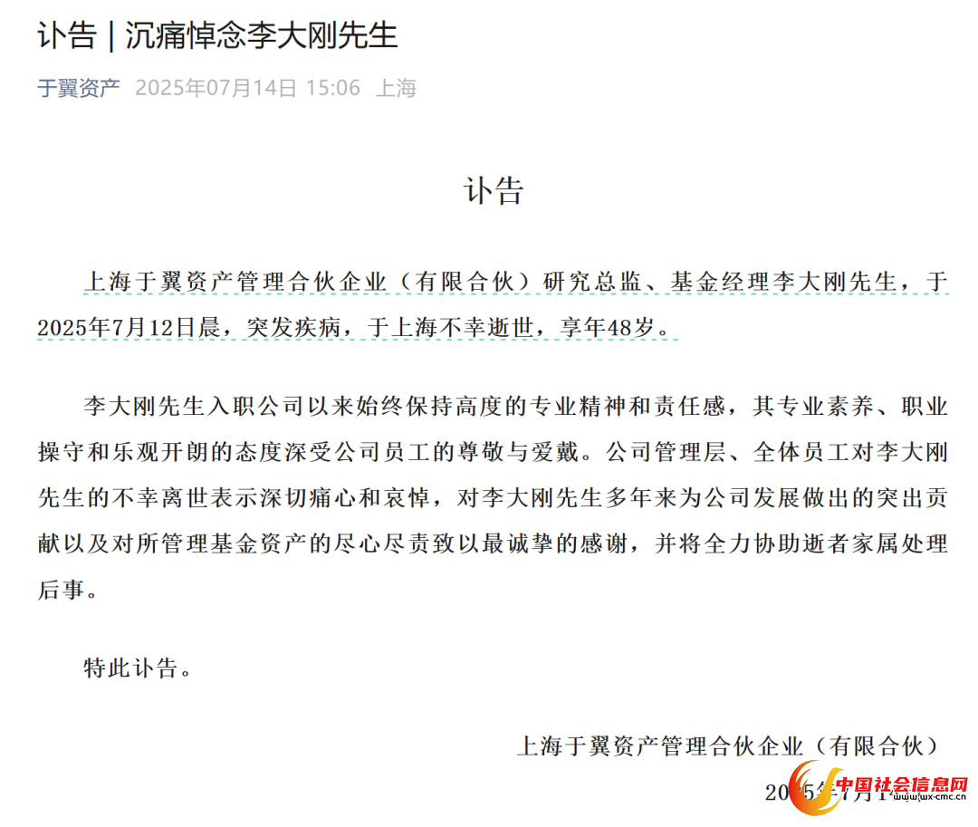 7月14日,知名私募上海于翼资产发布了一则讣告,该公司研究总监、基金经理李大刚,于2025年7月12日晨,突发疾病,于上海不幸逝世,享年48岁。