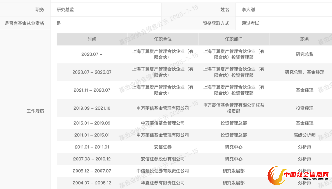 公开资料显示,李大刚拥有复旦大学企业管理硕士学位,2004年起从事金融相关工作,曾任职于中信建投证券研究所、安信证券研究所,担任分析师;2011年1月加入申万菱信基金,曾任行业研究员、节能环保研究组组长等职务,2015年开始担任基金经理,管理公募基金产品,在申万菱信基金工作长达10年时间。2021年11月,李大刚加入于翼资产,担任基金经理,后来成为研究总监。