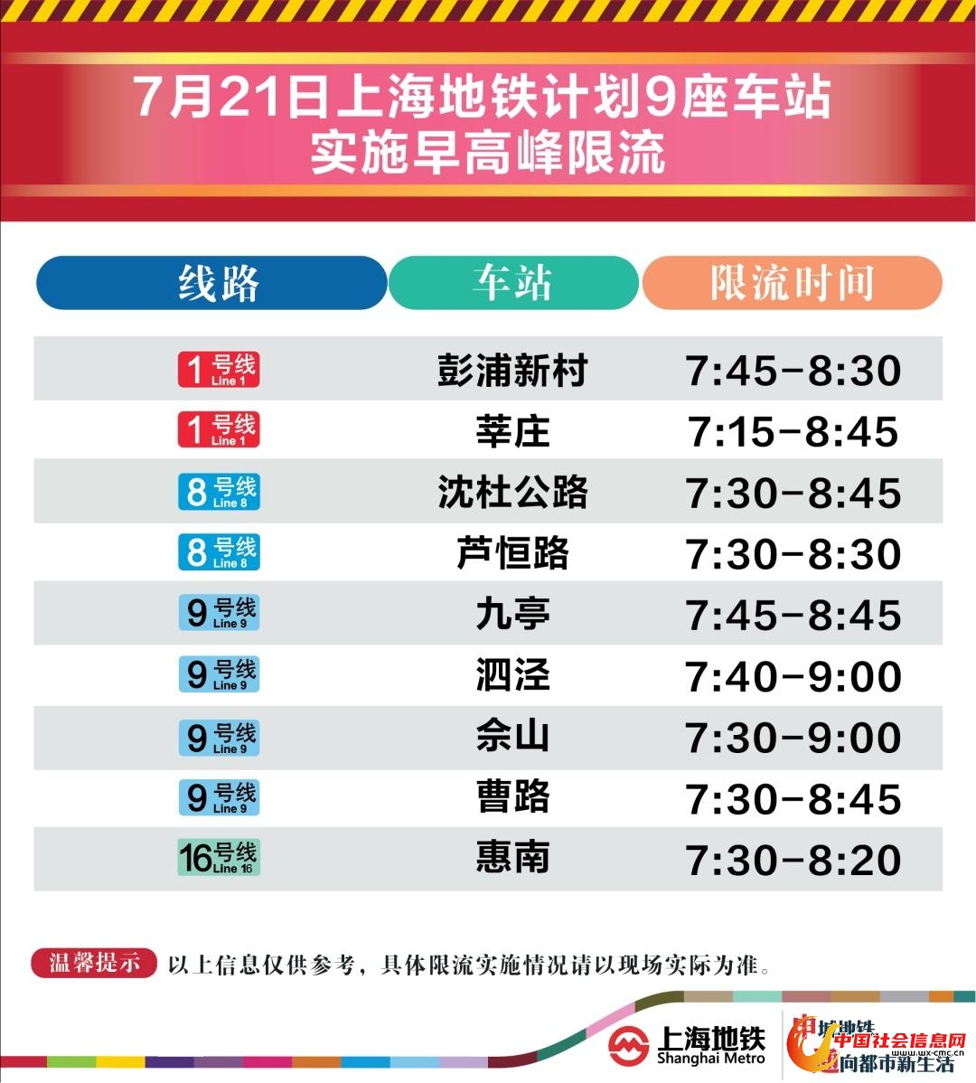 7月21日,上海地铁早高峰限流措施将继续实施,届时将有 9座地铁站早高峰计划限流。
