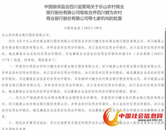 2022年8月,乐山农商行召开年度股东大会,审议通过乐山农商行吸收合并犍为农商银行、峨眉山农商银行、井研县联社、夹江县联社、沐川县联社、峨边彝族自治县联社、马边彝族自治县联社等7家农信机构,并审议成立乐山市市级农村商业银行筹建工作实施小组等议案。同年11月22日,原四川银保监局发布批复,同意乐山农商行吸收合并7家机构。