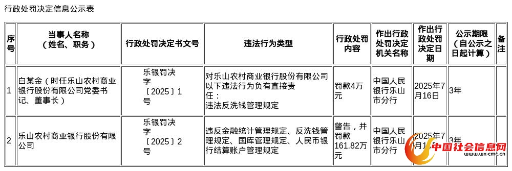 微成都报道近日,中国人民银行乐山市分行发布了罚单,剑指乐山农村商业银行股份有限公司及其时任党委书记、董事长白某金。