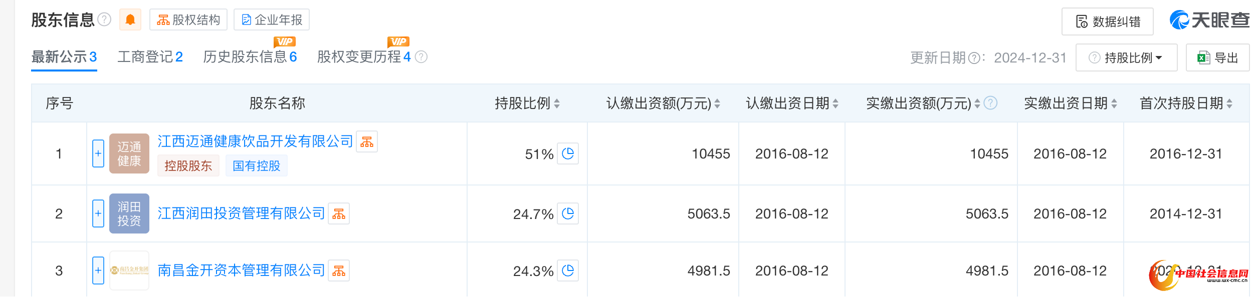 目前,润田实业的第一大股东为江西迈通健康饮品开发有限公司,持股51%;此外,江西润田投资管理有限公司和南昌金开资本管理有限公司分别持股24.7%和24.3%。股权穿透之后,实际控制人是江西省国有资产监督管理委员会。润田实业的法定代表人为刘晓权,其同时还担任公司董事、总经理,公司董事长为周容彬。