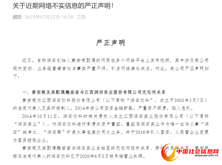润田实业表示,自称润田创始人黄安根配偶的网民在网络上持续散布涉及公司的不实言论,严重损害了公司品牌形象和市场声誉,对公司的正常生产经营造成了较大负面影响,对此,公司将依法依规对不实言论发布者追究法律责任。