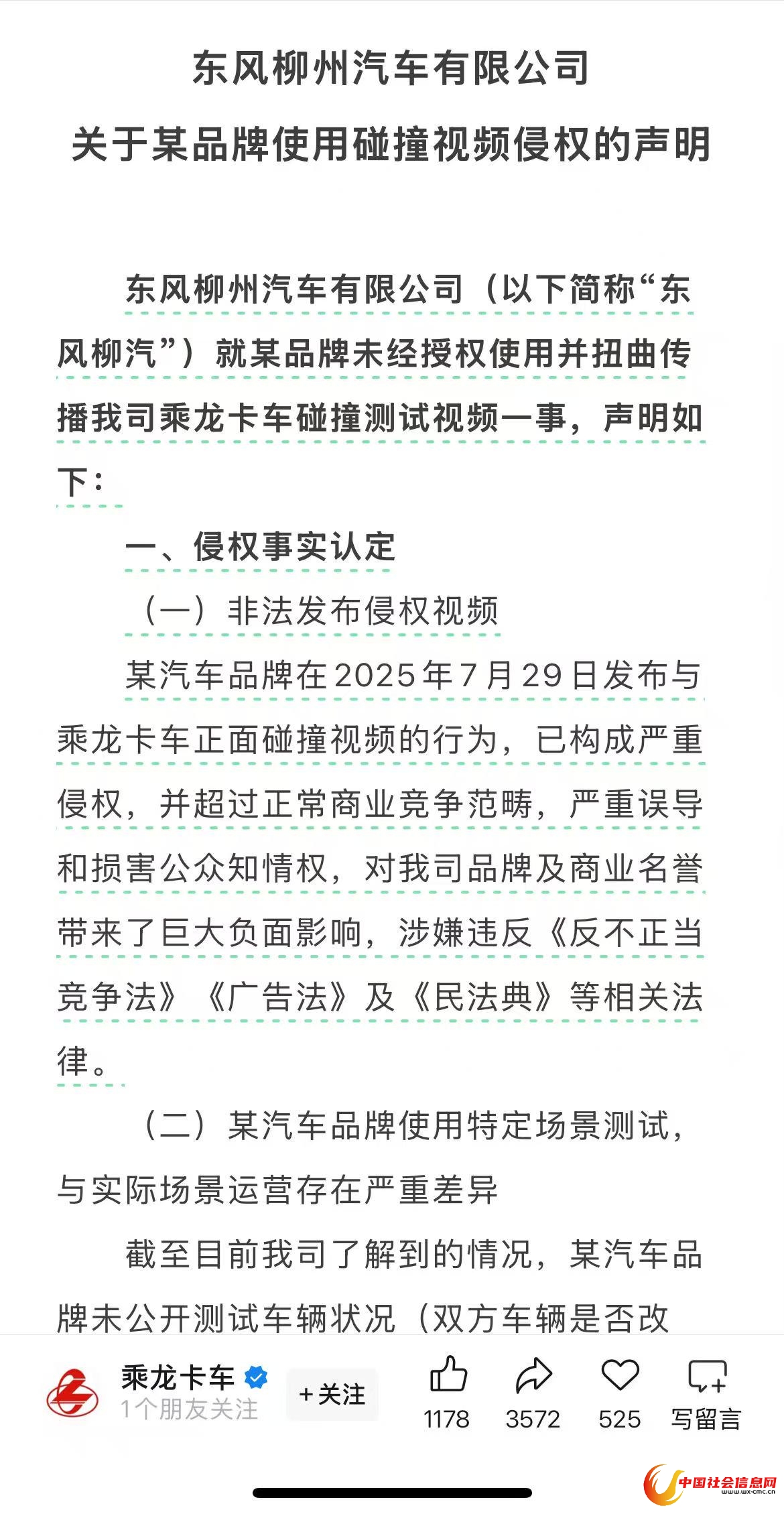 乘龙卡车表示:“某汽车品牌在2025年7月29日发布与乘龙卡车正面碰撞视频的行为,已构成严重侵权,并超过正常商业竞争范畴,严重误导和损害公众知情权,对我司品牌及商业名誉带来了巨大负面影响,涉嫌违反《反不正当竞争法》《广告法》及《民法典》等相关法律。截至目前我司了解到的情况,某汽车品牌未公开测试车辆状况(双方车辆是否改装、减配、卡扣是否固定、车辆是否过检等)、场景环境(测试场地状况、车速、驾驶状态等),通过自定义碰撞条件,特定设计非常规测试场景,发布与公众认知的正常碰撞结果偏差较大的碰撞视频,不仅贬低我司品牌形象,还容易对广大车主造成误导,形成安全隐患。”