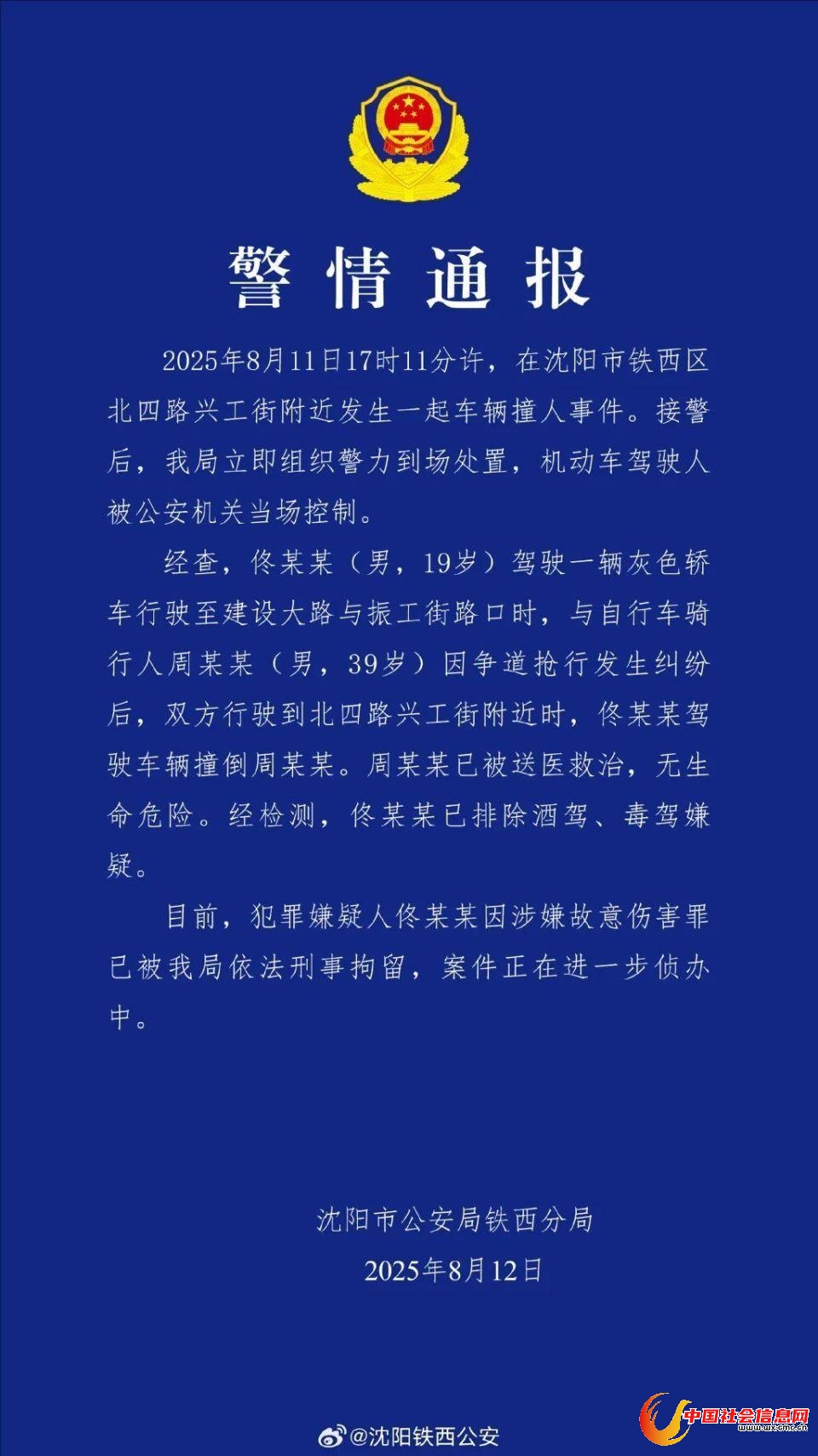 8月12日,沈阳市公安局铁西分局发布警情通报:2025年8月11日17时11分许,在沈阳市铁西区北四路兴工街附近发生一起车辆撞人事件。接警后,警方立即组织警力到场处置,机动车驾驶人被公安机关当场控制。