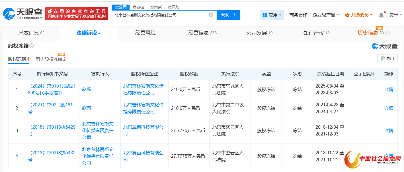 据天眼查显示,近日,北京普林赛斯文化传播有限责任公司新增一则股权冻结信息,被执行人为赵薇,冻结股权数额210万人民币,冻结期限为3年,执行法院为北京市东城区人民法院。