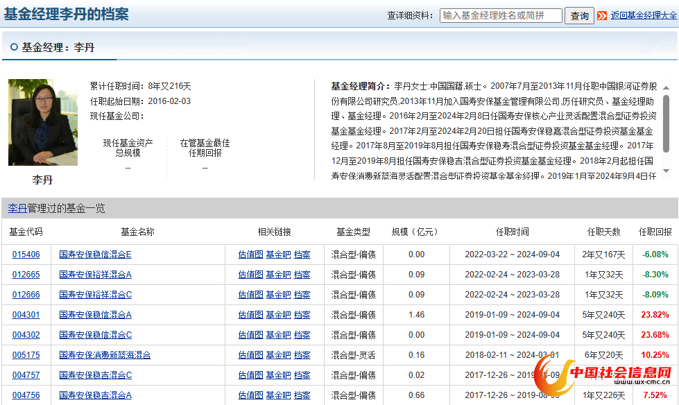 2024年2月起,李丹陆续卸任4只在管基金,最后一只是在2024年9月4日卸任的国寿安保稳信,卸任原因为“根据公司工作需要和人员配置状况”。