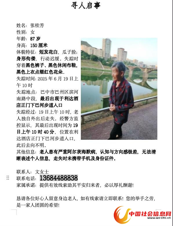 据《寻人启事》介绍,张桂芳,女,87岁,身高150厘米,体貌特征:短发花白,瓜子脸;身形佝偻,行动迟缓。失踪时穿着黑色裤子、黑色休闲布鞋,黑色上衣点缀红色花朵。失踪时间为2025年6月19日上午10时,失踪地点是巴中市巴州区滨河南路中段,最后出现于利达酒店正门下巴河步道入口。