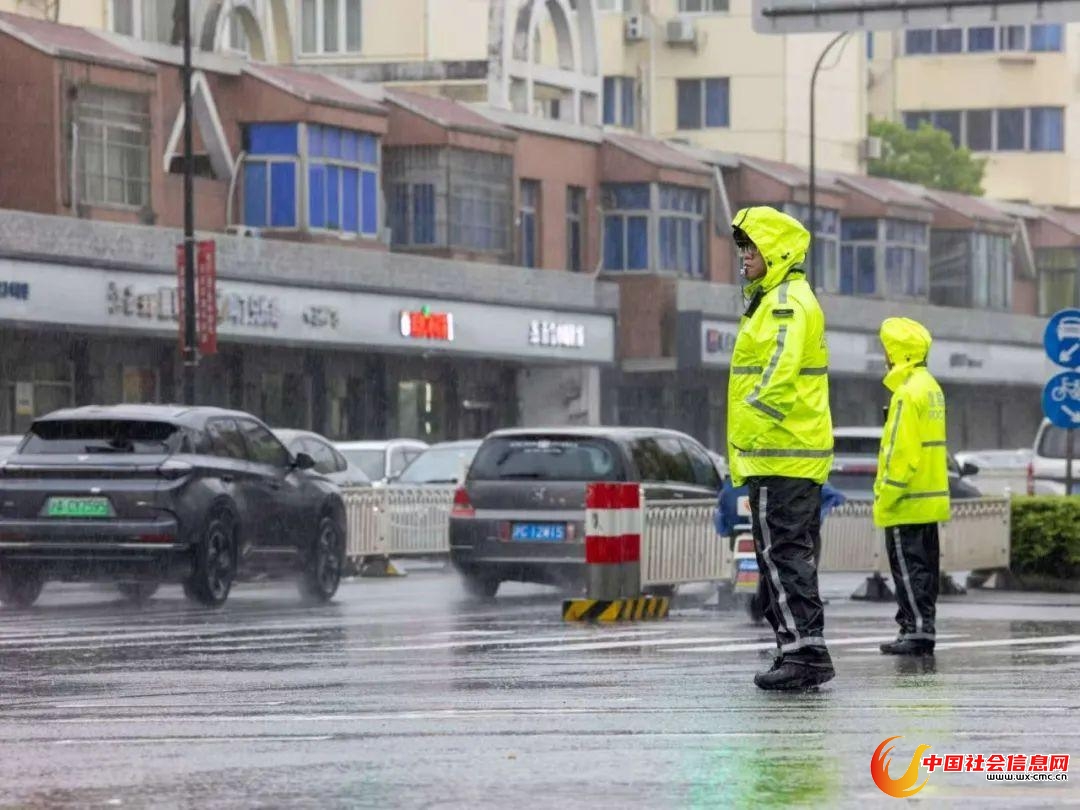 交警部门坚守在交通疏导一线。他们冒雨指挥交通,引导车辆安全通行。