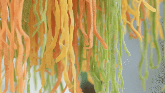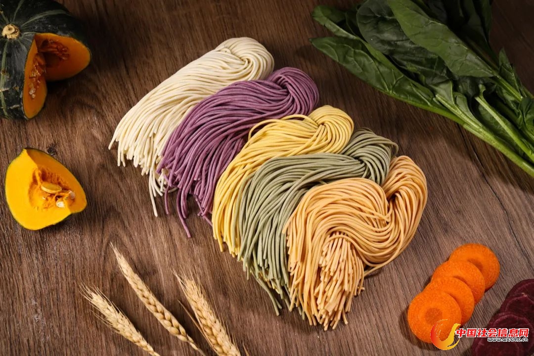 以没有任何添加剂的小麦粉为原料,加入了不同颜色的蔬菜汁。有橘色的胡萝卜、黄色的南瓜,紫色的紫薯,绿色的菠菜,米白的小麦面。