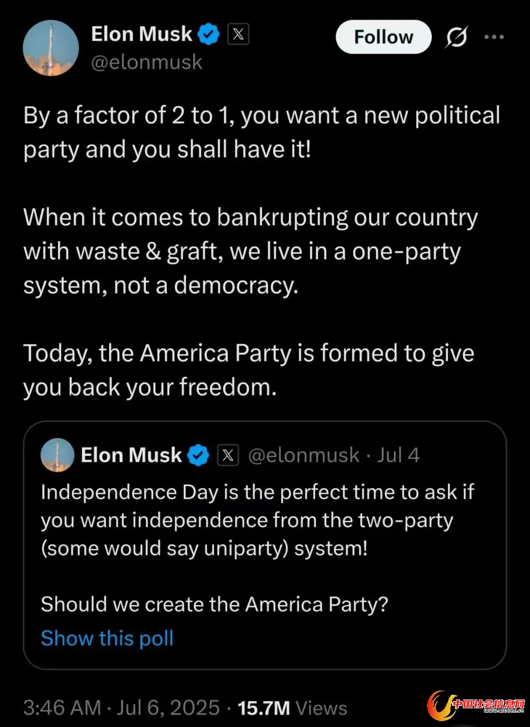 但是,当地时间7月5日,马斯克在社交媒体宣布成立“美国党”。按照央视的报道,“美国党”的成立将还给美国公民以自由,也将拯救“因浪费和贪污而破产”的美国。