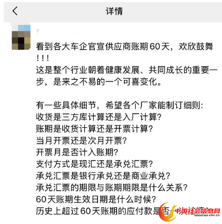 6月11日,有汽车供应商提出,希望车企对60天账期制定以下细则:“收货是三方库计算还是入厂计算?账期是收货计算还是开票计算?当月开票还是次月开票?开票月是否计入账期?支付方式是现汇还是承兑汇票?承兑汇票是银行承兑还是商业承兑?承兑汇票的期限和账期期限是什么关系?60天账期生效日期是什么时候?历史上超过60天账期的应付款是否一次结清?……”