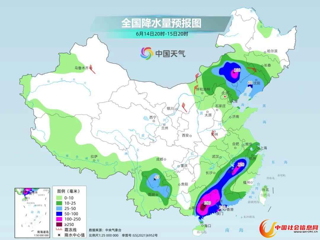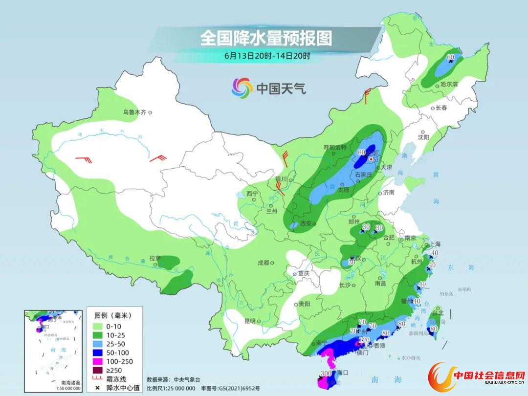 降水预报:6月13日20时至14日20时,海南岛大部、广西东南部、广东中南部、福建东部和南部及台湾岛南部等地有大到暴雨,其中,海南岛西部、广西东南部、广东西南部等地部分地区有大暴雨,海南岛西部局地有特大暴雨(250~300毫米),上述部分地区伴有短时强降水(最大小时降雨量30~50毫米,局地可超过70毫米),局地有雷暴大风等强对流天气。