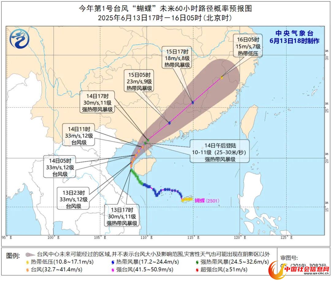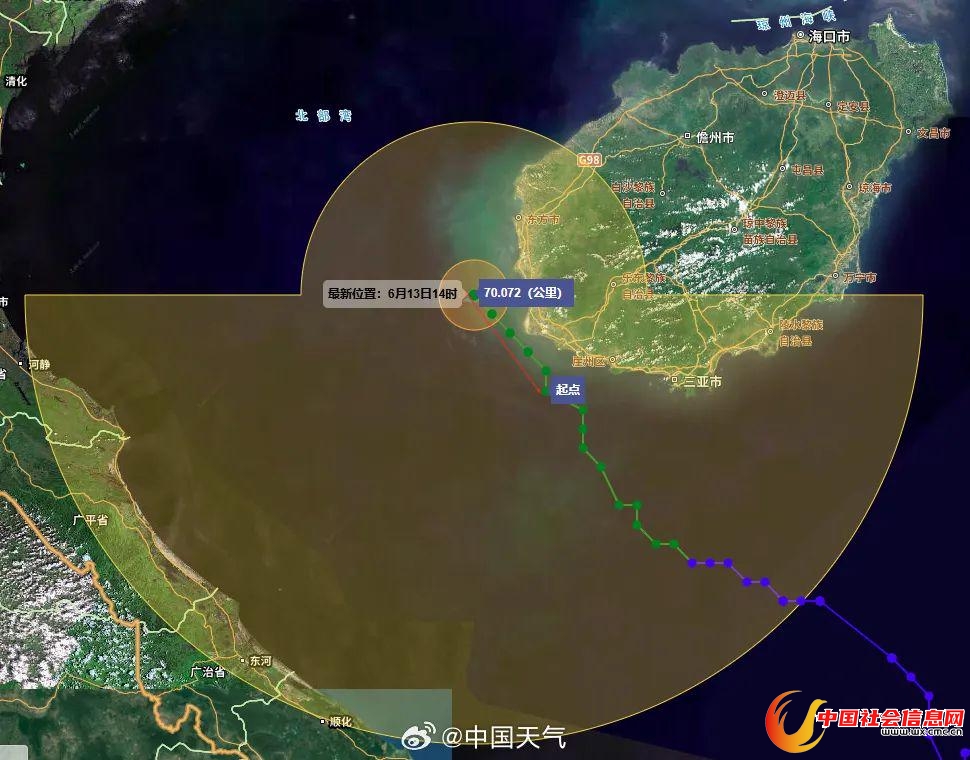 大风预报:6月13日20时至14日20时,南海西部、北部湾、琼州海峡、西沙群岛、中沙群岛、海南岛沿海、广东沿海、广西沿海将有6~8级风,阵风9~11级,台风中心经过的北部湾部分海域及地区风力可达9~11级,阵风12~14级。