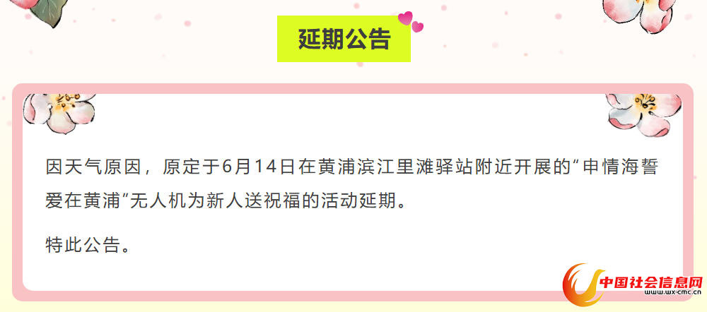 因天气原因,原定于6月14日在黄浦滨江里滩驿站附近开展的“申情海誓 爱在黄浦”无人机为新人送祝福的活动延期。