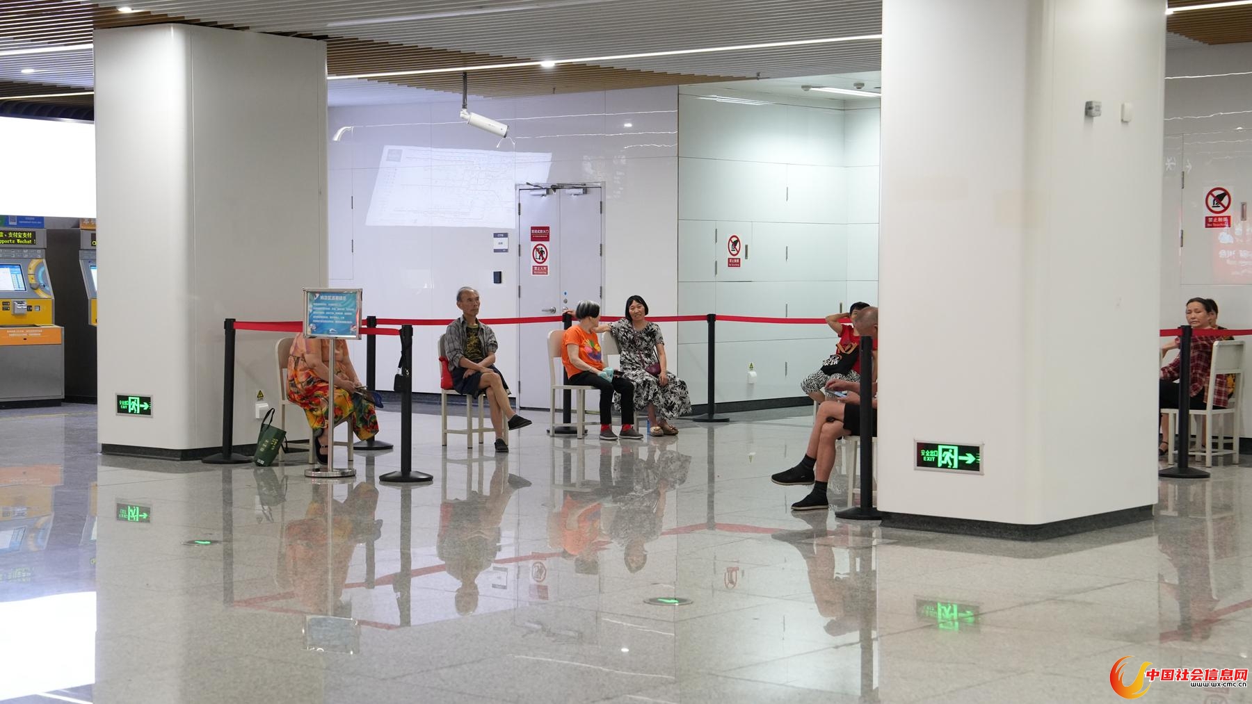 走进三元地铁站,隔离带围成的纳凉区里,10余把椅子有序摆放,不少市民在此休憩放松。