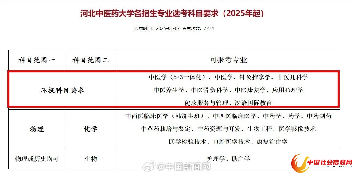 2025年重庆中医药学院分省份专业招生计划显示,该校中医学、针灸推拿学、中医骨伤科学、中医养生学等,招生选科要求为历史+不限。江西中医药大学2025年本科批次招生专业选考科目要求一览表显示,中医学、中医养生学、针灸推拿学、中医康复学、中医骨伤科学不再对考生提出科目要求。