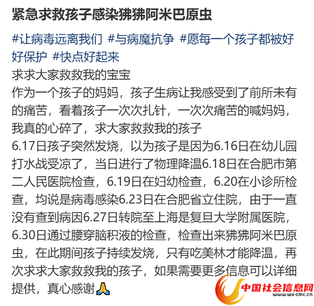 6月30日,男童在上海复旦大学附属医院通过腰穿脑积液的检查,检查出来狒狒阿米巴原虫。