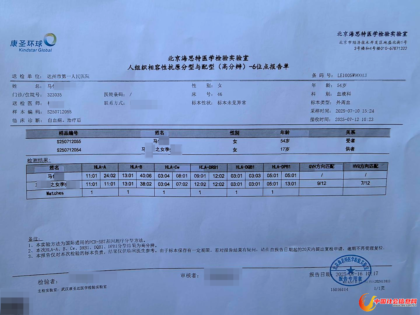 据达州市第一人民医院马女士主管医生唐医生介绍,这两份报告单是母女俩配型结果报告单,马女士在医院确诊为急性白血病,建议其尽快手术,其女儿与她配型成功。