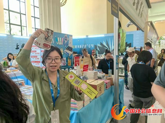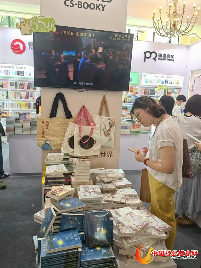 上海书展首日,记者走入上海展览中心,户外热浪滚滚不及现场购书人热情。场馆里人流如织,付款、盖章处常有排队。为了吸引更多关注,卖书人纷纷“卷”起来。出版社工作人员一手举着二维码,一手举着各式“无料”(免费周边)在展台前吆喝。全场打折、扫码关注领取礼品、盖章等都是书展标配,还有人不断加码。七猫小说展台装了一块大型竖屏,放起了小说改编短剧。博集天卷展台的挂壁电视上循环播放暑期档电影《长安的荔枝》幕后特辑,下面摆满马伯庸同名原著小说。