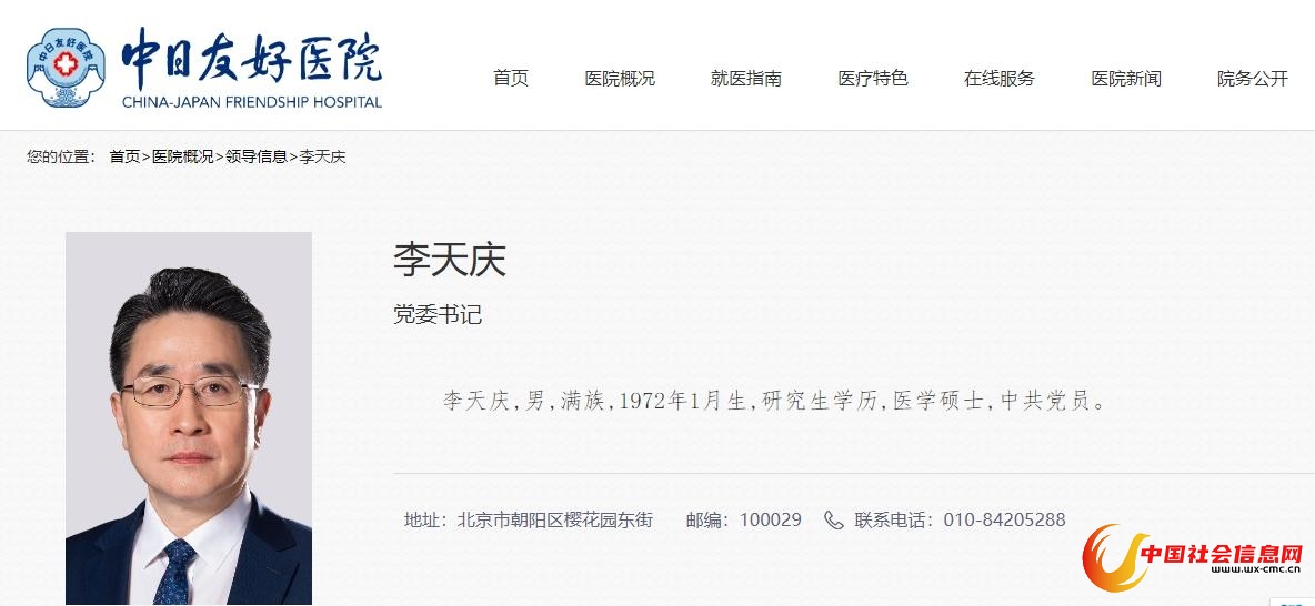 中日友好医院官网显示,现任党委书记为李天庆。此前该院党委书记为宋树立。