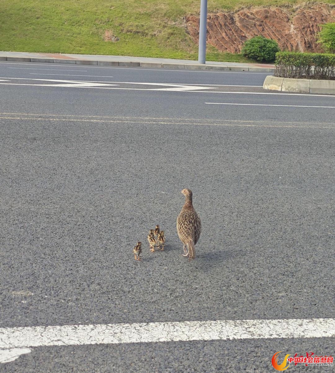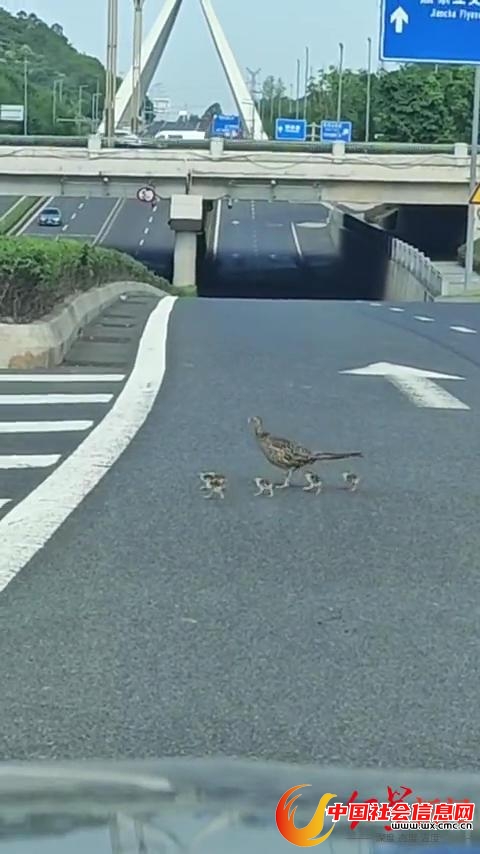 近日,家住四川天府新区的胡先生在与家人从鹿溪河回家的路上,偶遇环颈雉妈妈带小鸡过马路的一幕,并用手机将其记录下来发至网络,引发网友关注。