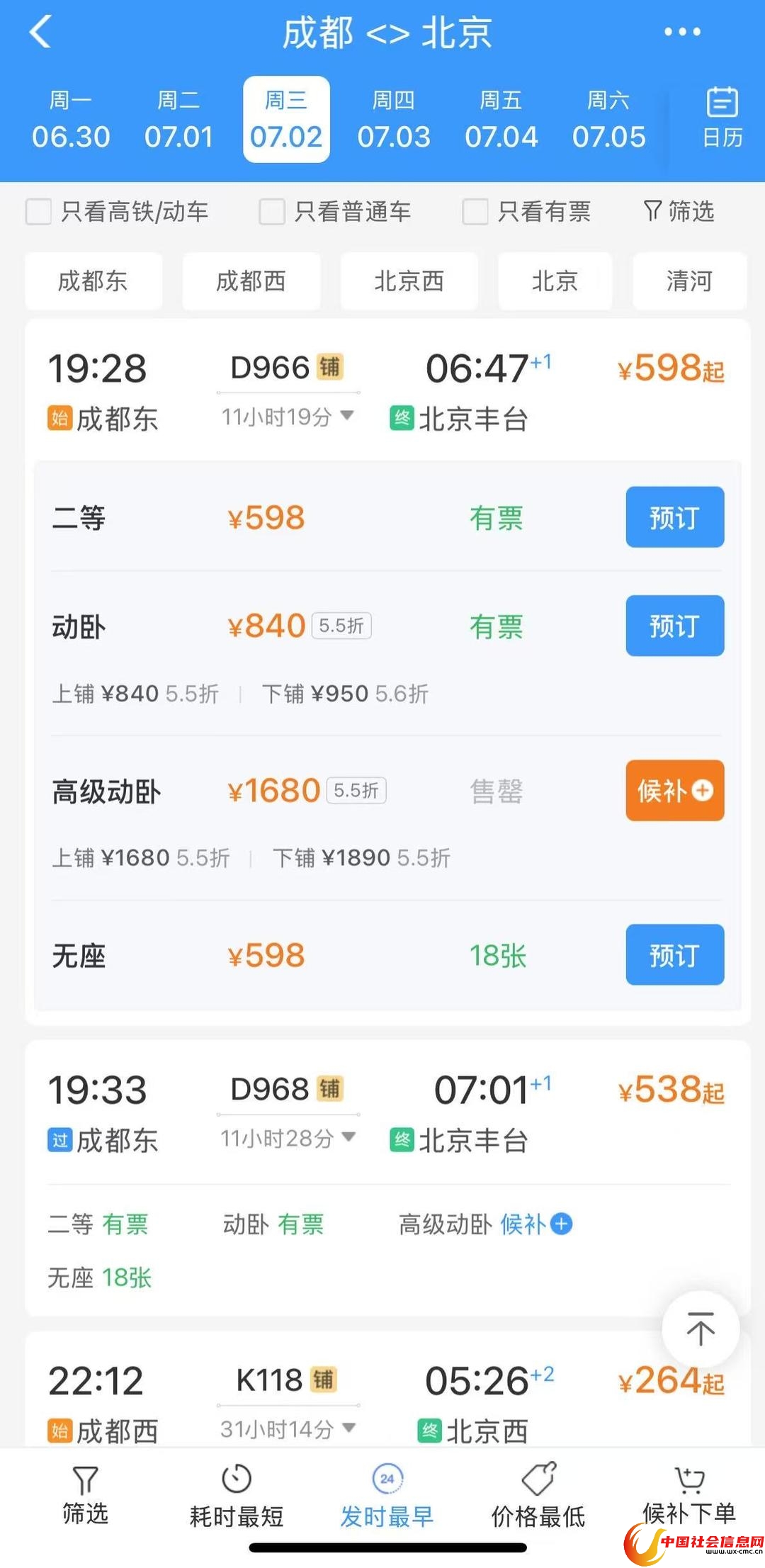 值得注意的是,成都至北京动卧列车从今日起,每日开行两班(周二除外),因此想要在周二出行的旅客,可能要选择其他方式了。另一个关键点是价格,动卧列车采用浮动票价,其折扣力度最大的日期在周六、周一,动卧上铺价格仅为810元。列车两头均有一节二等座车厢,因此该车也将为短途出行的旅客提供更多便利。