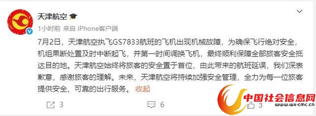 7月3日晚,@天津航空 微博通报: