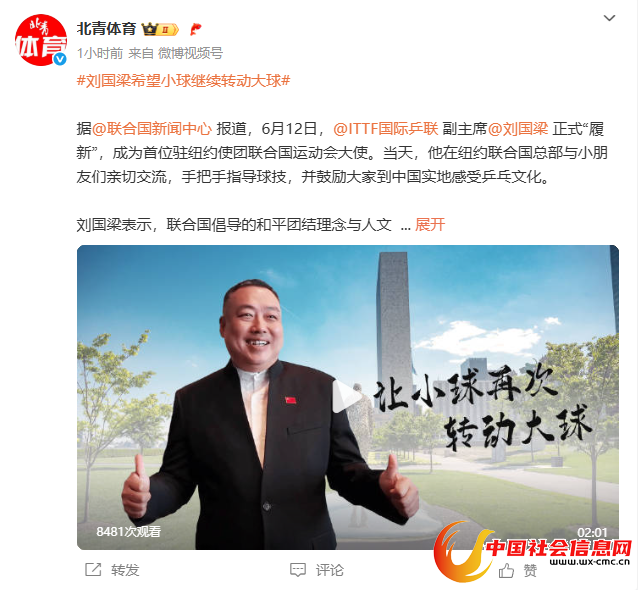 6月18日,据北青体育,@联合国新闻中心 报道,6月12日,ITTF国际乒联 副主席刘国梁正式“履新”,成为首位驻纽约使团联合国运动会大使。