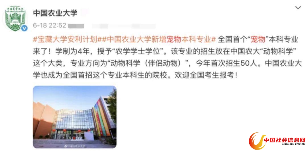 高考结束后,考生们马上又要迎来一轮新“战斗”——志愿填报。近日,中国农业大学动物科技学院的老师们就开始新一轮的本科招生宣讲,其中,他们介绍的全国首个“宠物”本科专业,引起网友广泛关注。