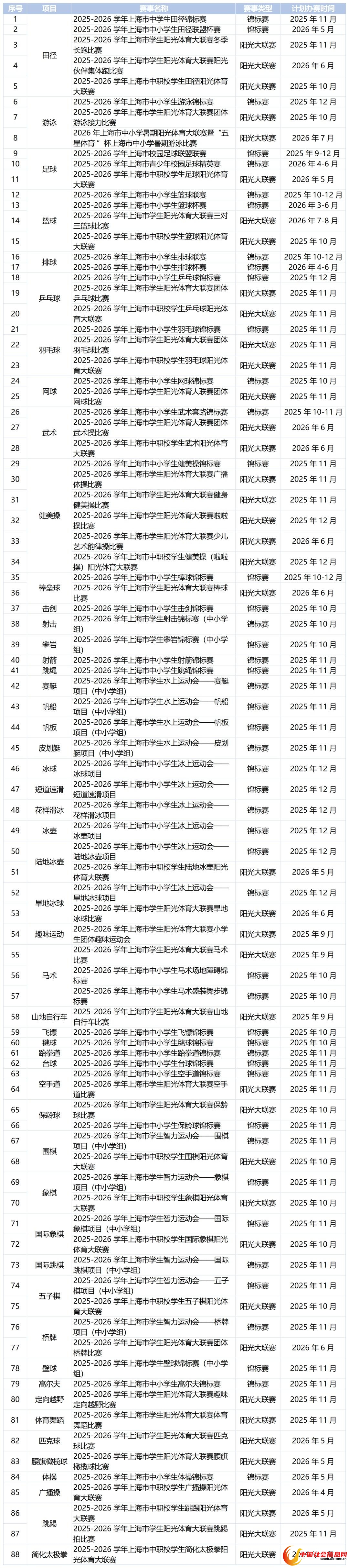 2025—2026学年上海市市级中小学生体育赛事竞赛计划