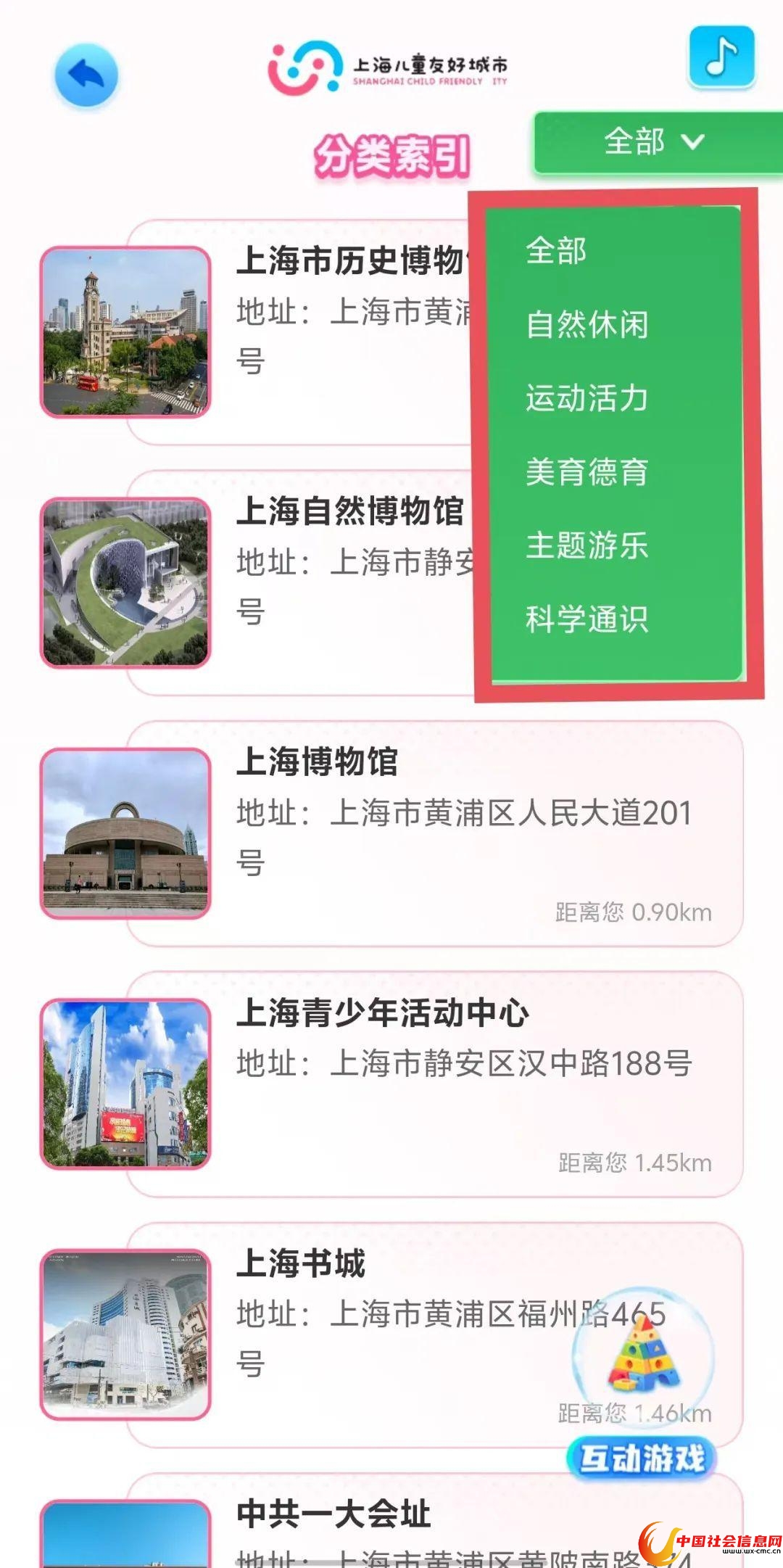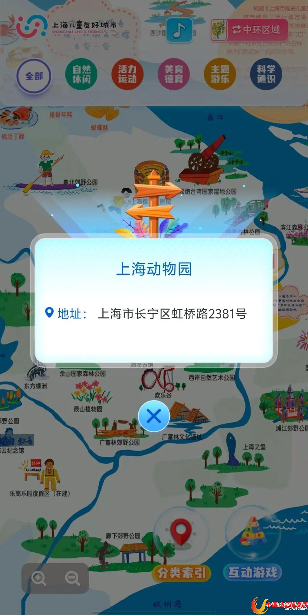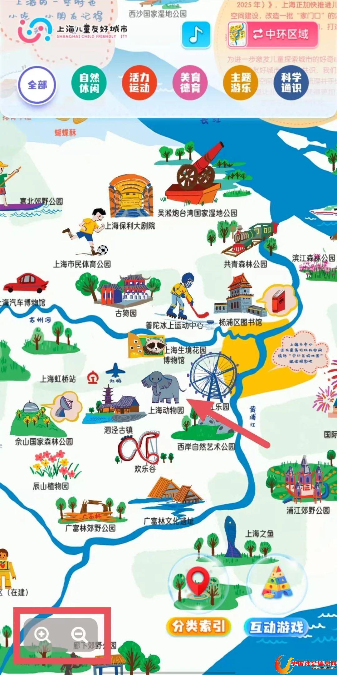 2、地标分类查询:分为“自然休闲”“美育德育”“活力运动”“科学通识”“主题游乐”等五类。可通过地图上方的按钮或地图右下方的“分类索引”查看对应地标。