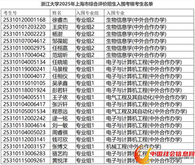 浙江大学公布了2025年上海市综合评价招生入围考核的考生名单。