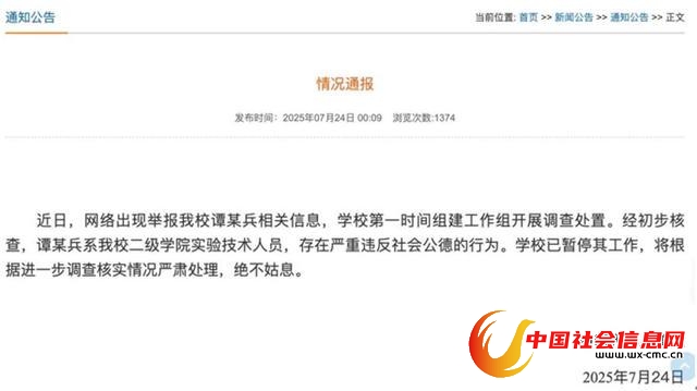 近日,网络出现举报我校谭某兵相关信息,学校第一时间组建工作组开展调查处置。经初步核查,谭某兵系我校二级学院实验技术人员,存在严重违反社会公德的行为。学校已暂停其工作,将根据进一步调查核实情况严肃处理,绝不姑息。