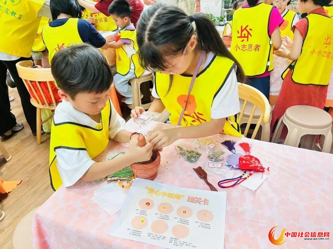 而在另一边,制作香囊的小组也忙得不亦乐乎。空气中弥漫着菖蒲、陈皮、迷迭香、香茅和紫苏叶混合的独特芬芳。这些具有天然驱蚊功效的中草药,被孩子们亲手捣碎、混合、装入一个个精致的锦囊中。“我们每人要做两个香囊,一个留给自己,一个要送给更需要的人。”有孩子认真地说道。