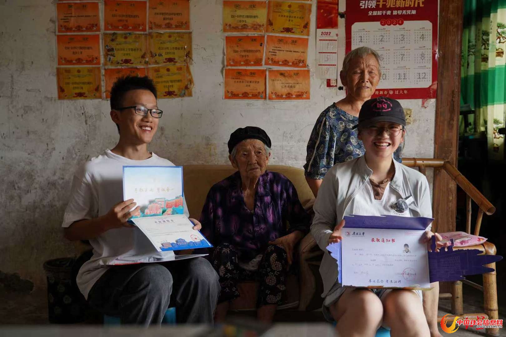 ▲兄妹俩拿着通知书和家里老人合影留念