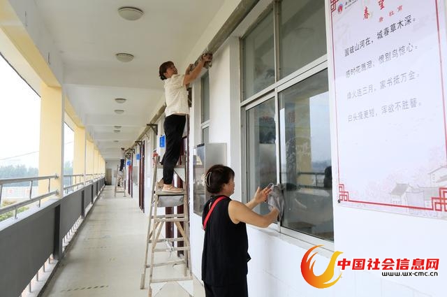 8月25日,工作人员在河南省洛阳市汝阳县直属初级中学进行校园卫生清理。新华社发(康红军摄)