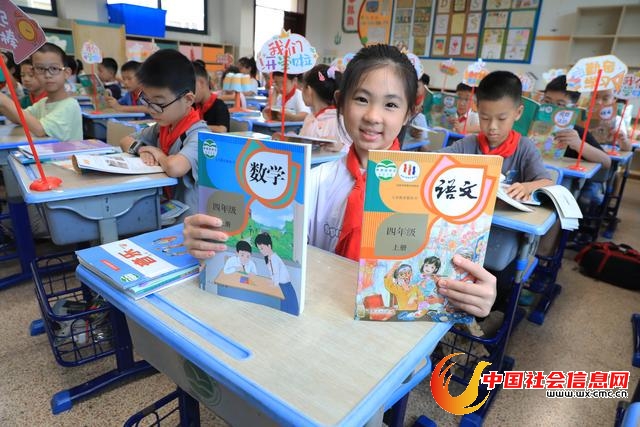 8月30日,在浙江省舟山市南海实验学校惠民桥小学校区,一名四年级的学生展示刚领到的新课本。新华社发(陈永建摄)