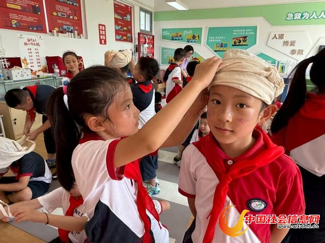 生命体验馆内,顾正红的故事被孩子们深情演绎,包扎三角巾、学习急救技能……