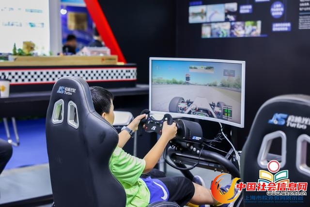 观众在上海市科技体育运动管理中心展位体验“竞速光轮虚拟赛车”(主办方提供)