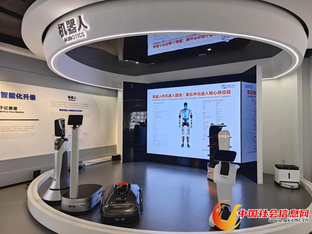 在奥比中光科技集团股份有限公司的展厅里,一个白色的立式送餐机器人在展示区里来回穿梭,迎宾机器人、扫地机器人、割草机器人等产品也陈列其中,“忙碌”的送餐机器人时而绕过它们,时而穿过其间,总能灵巧地避开障碍。