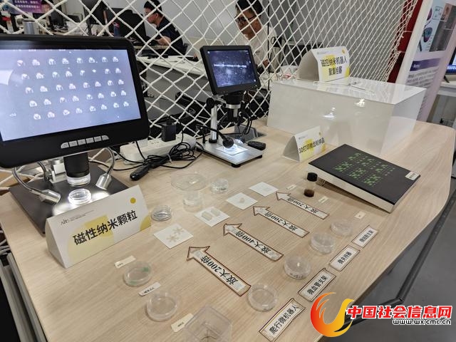 陈列台上,工作人员拿起一个拇指大小的透明瓶子进行展示。乍一看,瓶内只是装有一些深色浑浊液体,但当它被放到显微镜下后,记者才看到它的“真容”——一个个形如“颗粒”的磁性微纳米医疗机器人。