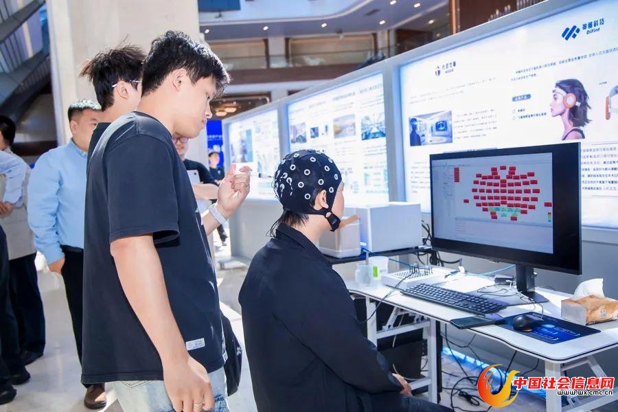 脑机接口企业正在集聚区的一个展厅中向参观者介绍技术成果