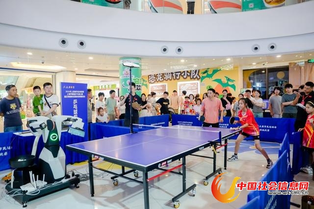 走进信业购物中心中庭,原本的消费空间被临时改造为充满活力的乒乓赛场。最吸引眼球的莫过于科技感满满的智能乒乓球桌,搭载的高精度传感器和智能发球机,不仅能实时捕捉分析击球速度、旋转和落点,为参与者提供即时数据反馈,更能根据选手水平自动调整发球难度,让专业和业余爱好者都能乐在其中。