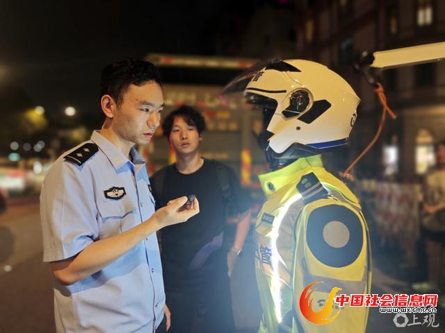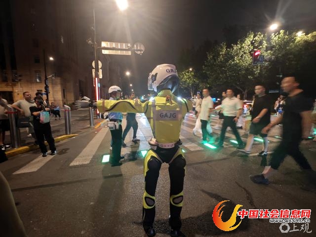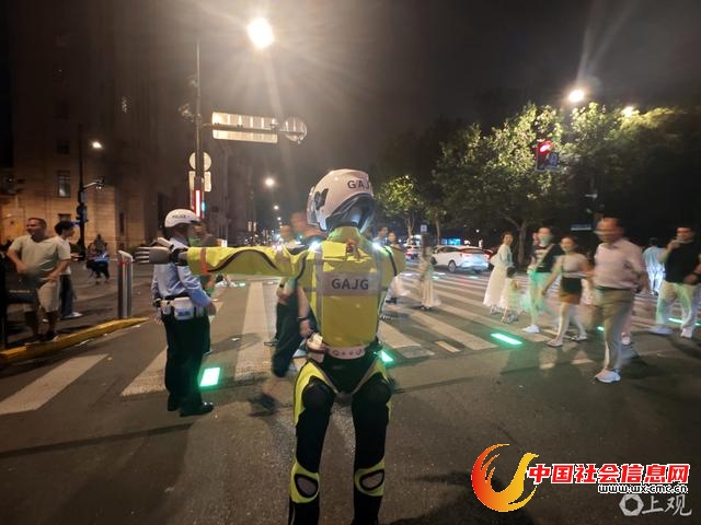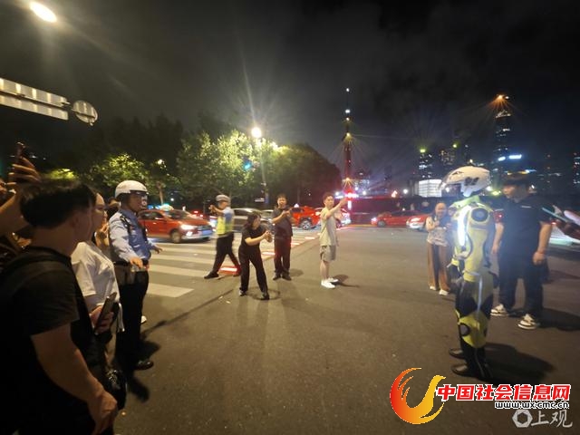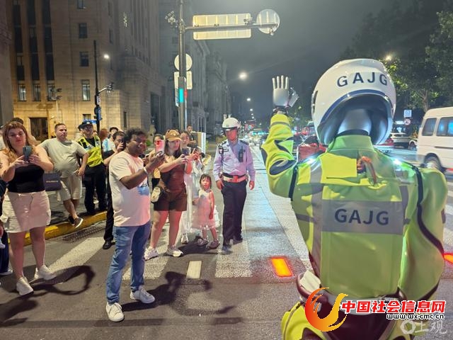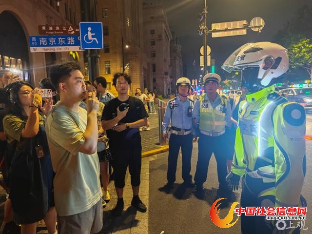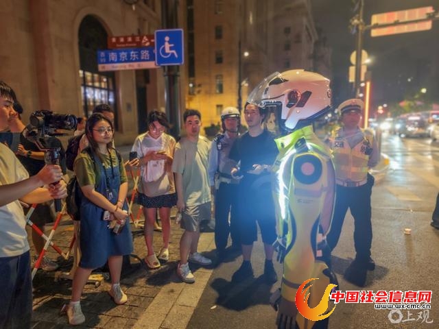 2025年7月23日晚,在上海黄浦区南京东路中山东一路路口,一台人形机器人在进行交通管理场景学习,引起过往行人关注。