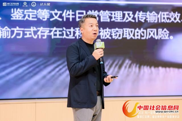 联通上海沃橙信息技术有限公司副总裁、首席市场官包俊介绍了一款叫作“法智云-5G律政保险箱”的产品。他介绍,对中小律所而言,在重要材料的收集、存储、法律效力确立、业务办理等环节中,面临着没有安全高效的重要材料汇聚手段、没有安全可靠的存储设备、没有快速且低成本的固证手段等问题,“我们这个‘保险箱’的基石,是高速5g专网,相当于为数据开设VIP通道,保证其高效流转。”