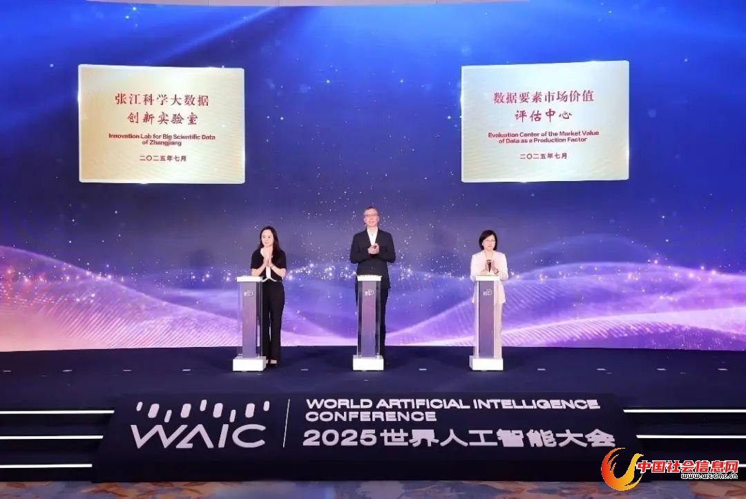 7月27日上午,2025世界人工智能大会浦东新区人工智能产业生态全球推介大会在浦东新区举行,上海市数据局副局长钱晓、浦东新区区委常委徐徕、上海财经大学副校长刘莉亚在活动上共同为数据要素市场价值评估中心揭牌。
