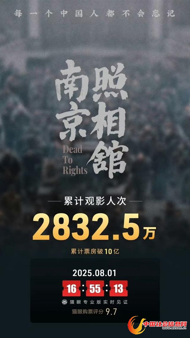 据猫眼专业版数据,截至8月1日16时55分13秒,《南京照相馆》累计票房破10亿,成为2025年春节档后首部票房破10亿电影,暂列2025年票房榜第四位。
