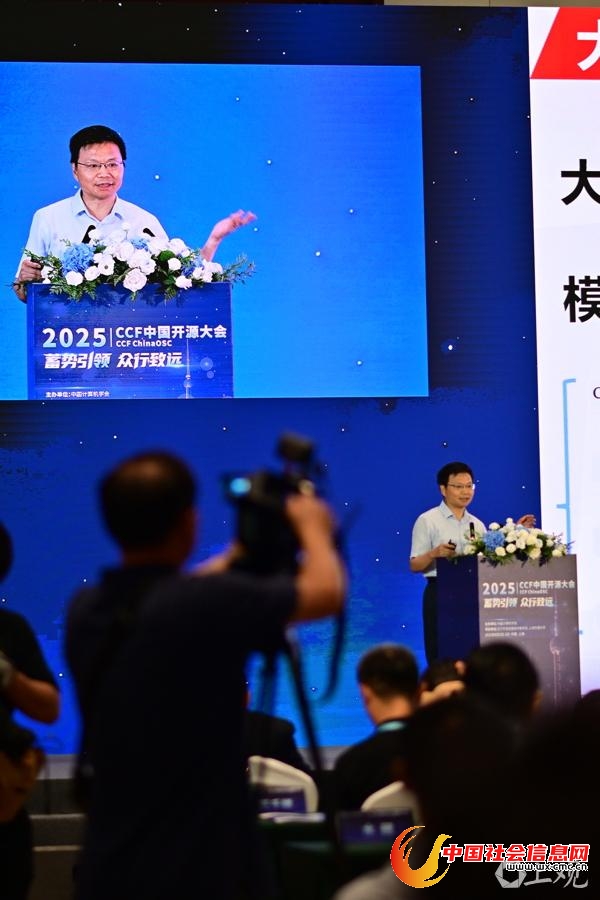 北京大学教授、上海交大人工智能学院首席顾问鄂维南院士向大会报告数据基础设施建设。徐瑞哲 摄